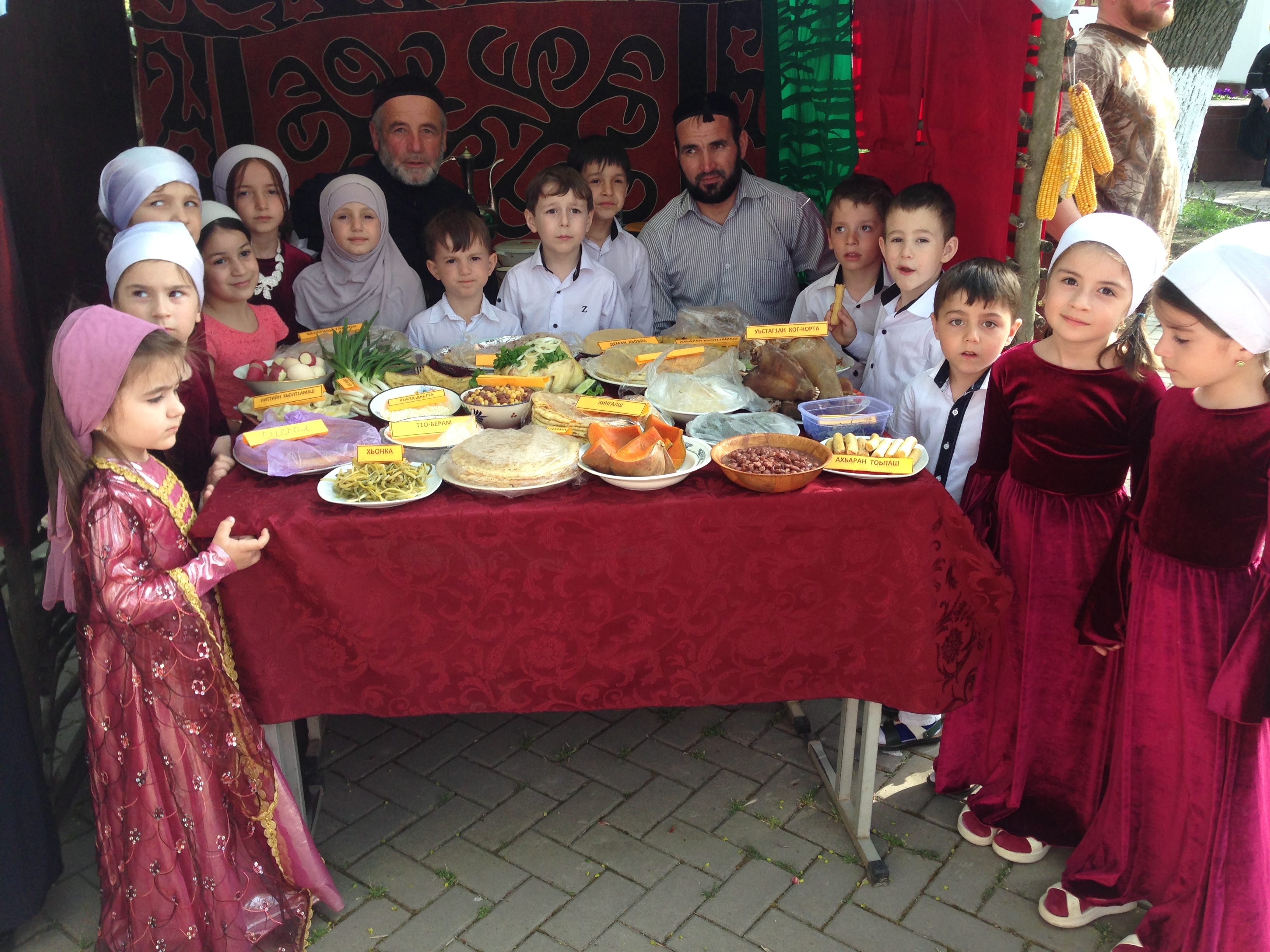 Проходила выставка национальных блюд, где школы района представили изобилие блюд чеченской кухни. Были наши традиционные жижиг-галныш, кукурузные лепешки, сискал, ч1епалгаш, хингалш, т1о берам, плов и многое другое.