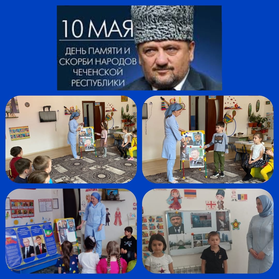 В ДОУ проведены тематические беседы «Наш Первый Президент»,посвященные Дню памяти и скорби в группах детей старшего дошкольного возраста. Воспитатели ознакомили дошкольников с историей жизни и деятельности Первого Президента Чеченской Республики, Героя России Ахмат-Хаджи Кадырова (Дала г1азот къобалдойла цуьнан!) . Какие трудности пережил он во время возрождения нашей республики, как он стремился к тому, чтобы и взрослые и дети жили под мирным небом. Ахмат-Хаджи Кадыров отдал свою жизнь ради благополучия своего народа. И память о нем будет вечно жить в наших сердцах…