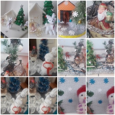 На выставке были представлены поделки воспитанников всех групп детского сада, изготовленные совместно с родителями. Мягкие игрушки, открытки, елочные игрушки, композиции из природных материалов, – все это сделали дети своими руками. На тему "Зима" из разного материала были представлены забавные Снеговики. Много поделок было уделено главному атрибуту новогодних праздников – елке, они сделаны из шишек, бумаги, из новогодней мишуры, ватных дисков. Все участники выставки смогли проявить свою фантазию и творческий потенциал. Мы благодарим родителей, принявших активное участие в выставке.